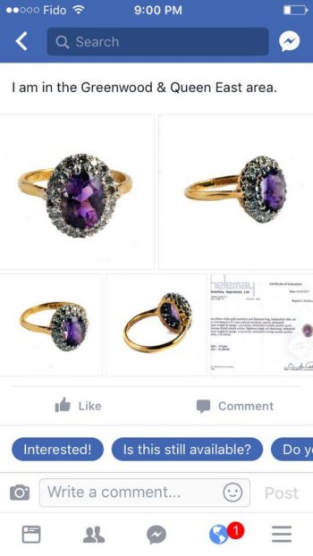 He saw an ad one day for a metal detector on craigslist. “The ad brought back a memory when I was in South Africa. I remember seeing an old lady on the beach searching for treasure with one. I responded to the ad, feeling somewhat sad that the young guy who was selling it, did so to buy his girlfriend a guitar.” A noble gesture for sure and in his first week, Alex found a gold ring. “Then, I was hooked!” he laughs. He’s found mostly junk, but the odd time he’ll find a little treasure which keeps him going. “Detecting on land is hard. I eventually moved to water, starting in Lake Ontario. Once I did that I never went back!”. His greatest find was a wedding band dating back to 1884. (See pic) “I was fascinated by this and did everything I could to trace the ring back the family somehow, including going on to Ancestry.ca. The best I could get was that the couple were from Hamilton, had one son, who never had children. The story kind of died there. It’s a keeper. I’m not selling that, but have sold many of my finds.” He showed me many of them. Fantastical pieces. Many from the 1930s and 40s, up to the 60s/70s. Mostly rings. Some custom-made, worth thousands of dollars, others with gems and diamonds worth as much or more. “It depends on the gold, the diamonds and the quality. I have a great appraiser.”