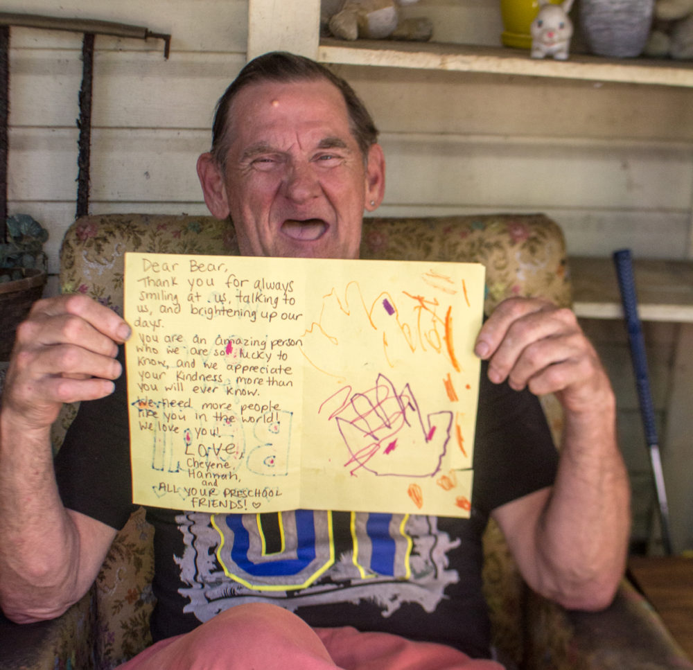 How do you survive? I asked him. “On my pension. This place is cheap and I do odd jobs here and there. I was a ‘cleaner’ for the bikers way back when and still clean bikes, cars, sell things, help an old lady down the street with her garden, collect and give things to people in need, that sort of thing.” He calls out to Richie, his neighbour, the cat comes home and then Bear rushes into his apartment to show me something. “The kids made this for me today.” His eyes glaze over again. Happy tears this time. “It just made my day! My week!” I read it. It’s beautiful. A ‘thank you for being you’ card from the kids at SkyBlue Studio and their teacher Kerry. I wanted to burst into tears. Instead, I turn the tone and ask him where his teeth are. “They’re like the stars my dear, they only come out at night.” We both laughed. A much needed moment of levity.