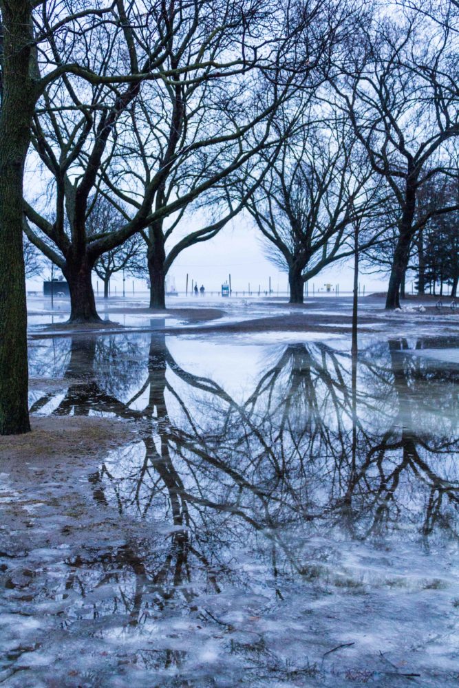 The day I took these photos was the day my Mom had passed away. It was around 4:30-5pm on Feb 20th and I’d just driven from the hospital after many hours there and the sorrow of leaving my Mom, and her leaving us. When I got home, my dog was itching to go out, so we drove down to Ashbridges Bay. When I saw this, I was bowled over by this ‘flood’ of melted snow. It was odd, but beautiful. And it was foggy. I was in a fog. Fog seems to add sadness and beauty to things I find. And silence. Kind of perfect really. I remember posting these photos on Facebook when I got home and messaged a friend asking, “Is it horrible of me to post photos the day my Mom died?” She immediately wrote me back and said, “No, of course not. It’s your connection to people and allowing you to do what you love, with love.” I thought that was sweet. The days that followed this one, the weather spoke to me vividly. There was an incredible sunset the night of Mom’s funeral and the next morning (and late afternoon) sunbeams that shot through the grey clouds. I remember looking up, smiling and thinking she was sending us a message. I haven’t seen an amazing sky since then, but I haven’t really paid attention. Those days were super-charged, and seem to have carried me along.