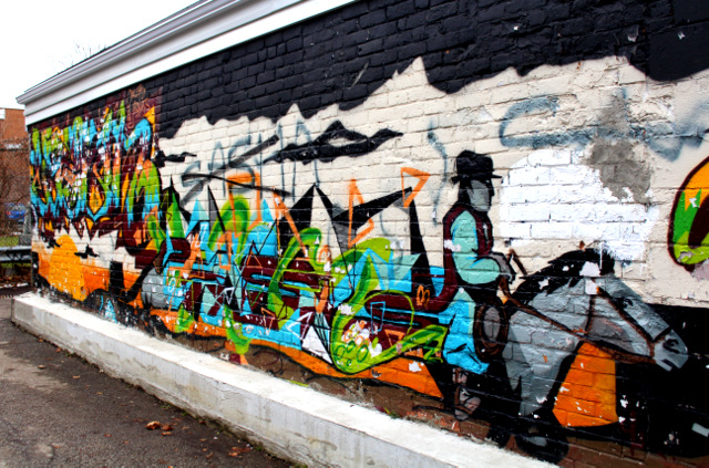 January 7, 2016 In A Day in the Life of Leslieville Day 356: ‘Earth without Art is just ‘Eh’ – Author Unknown Descendant Pizza, Queen St. Sears St. Michael & MichaelGraffiti art at back of Pape Ave. Tags: artgraffiti
