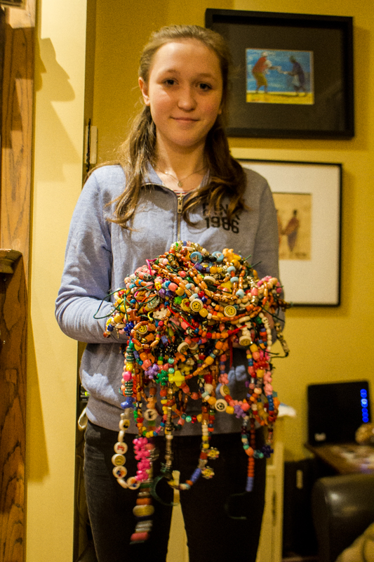 To understand the number of treatments, tests, surgeries, pokes and prods she’s endured, Stephanie has a collection of what are called Bravery Beads. When she brought it out to show me, it looked like a ceremonial African headdress. She’s collected thousands of beads – each one symbolizing a needle, an x-ray, an MRI, a surgery and so on. I was stunned. Seeing that really hit home just how much of her young life has been spent in our hospital system.