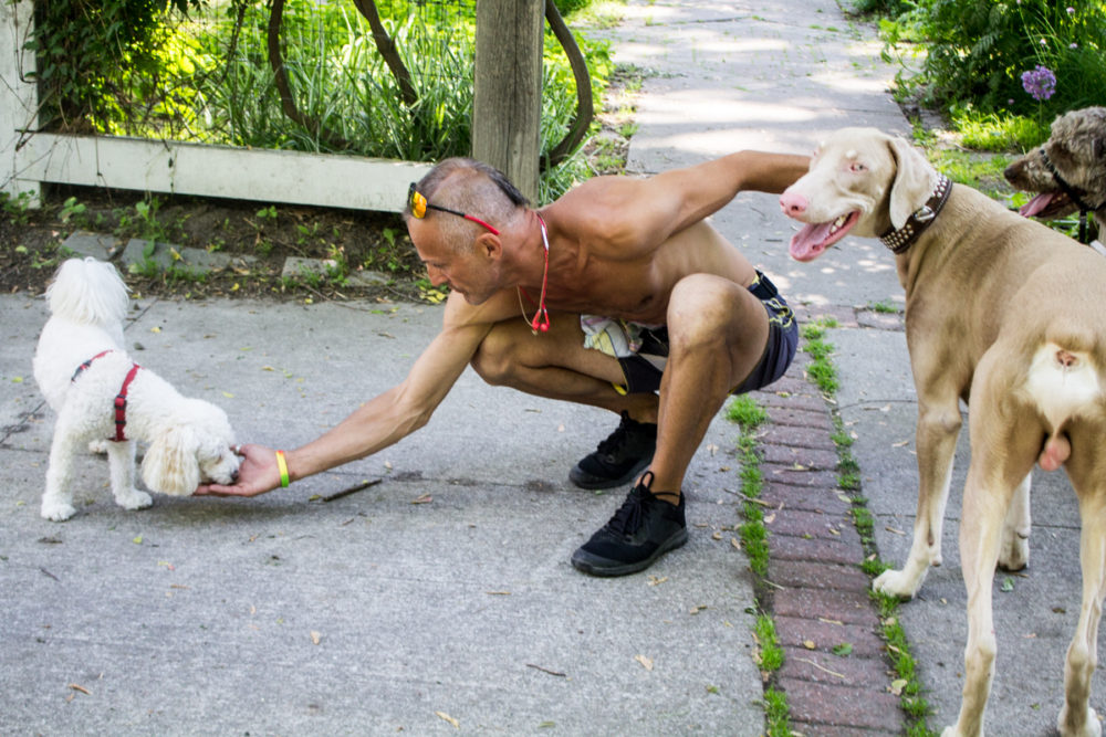 Meet Jimmy. A familiar face to many, Jimmy has been walking dogs in the hood for years now. It’s hard to miss him. His flamboyant style and tanned buff physique in Summer are part of Leslieville’s landscape. He’s the quintessential ‘happy guy’ and the Pied Piper of the dog world. I’ve been bumping into Jimmy regularly since 2009. I know my 3 loved him. Every morning at Maple Leaf Park we were always greeted with, ‘Good Morning Ladies’. And when I had George, ‘Good Morning Ladies, and Gentleman.’