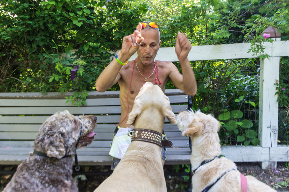 In 2009, he moved to Leslieville. After his release, the first thing he did was adopt another dog, Cinnamon. He began walking Ritchie and Cinnamon and engaging, as he does, everyone in the area. He started taking neighbour’s dogs and other friends’ dogs for walks. In 2012 he received his Landed Immigrant Status and celebrated in true Jimmy fashion. Par-tay! He lived above Queen Pita, which he loved, which then morphed into The Hummingbird, then AAA. He lived there for 8 years before moving downtown this past February. “With 3 big dogs of my own now and often caring for others, I needed a bigger space.” Jimmy comes back often to Leslieville to walk his pups and visit all of us. If you don’t know him, pass through Maple Leaf park on any given day and you’re likely to see him with his Dobies Bonnie, Baby and Armani, if not more dogs, chatting up the locals, spoiling all the dogs and generally brightening everyone’s day.