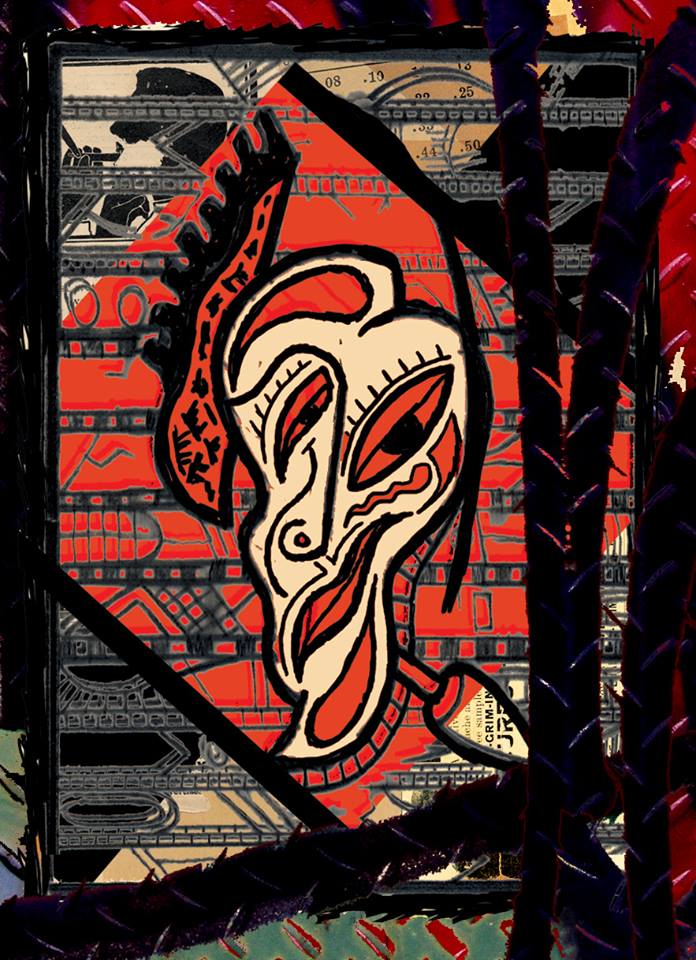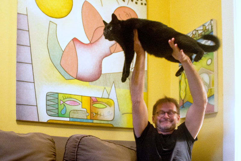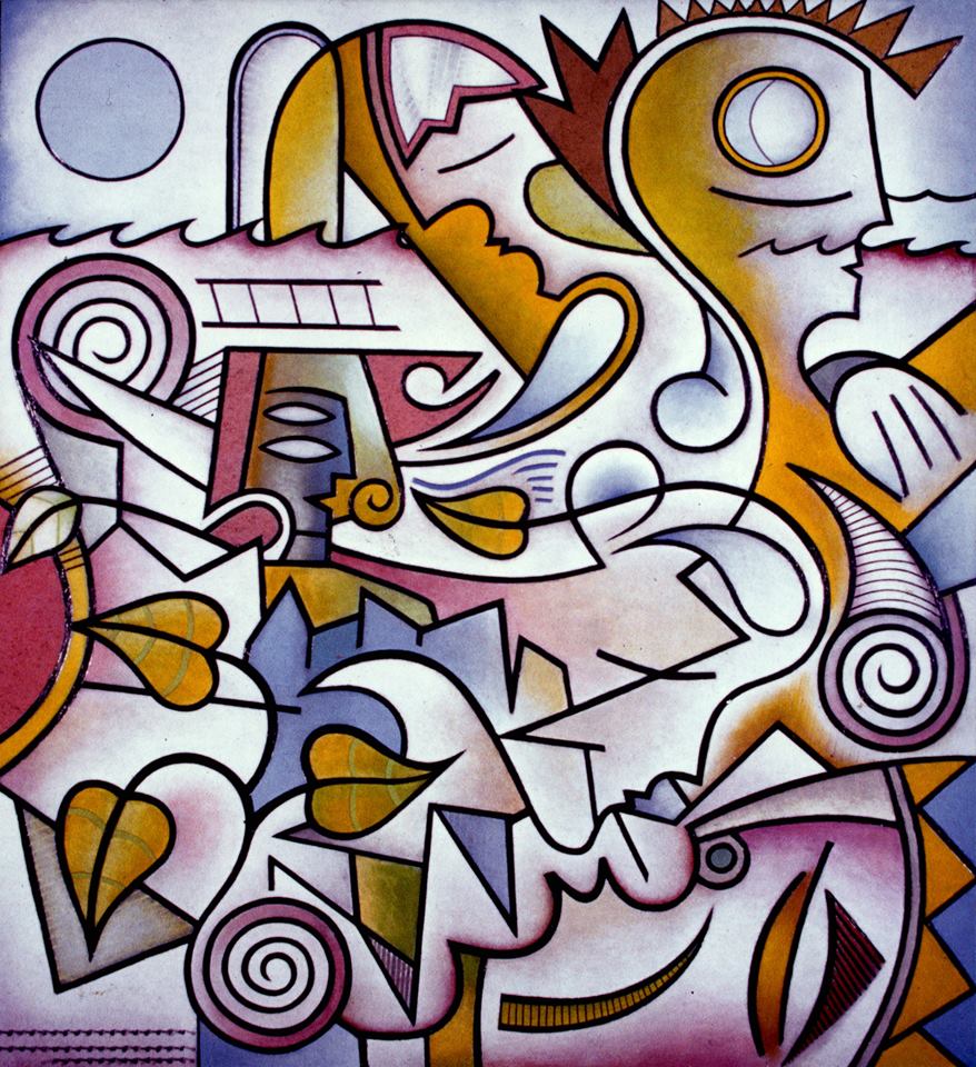 Born in Windsor, Matthew actually grew up in Detroit. With an American dad and Canadian mom they border hopped a lot and settled in Detroit in 1967. His mom is an artist and dad a creative director/writer, so the apple didn’t fall too far from the tree. ‘I grew up wanting to be an artist and writer, and that’s pretty much how it turned out!’ Essentially self-taught, he credits Paul Klee, Picasso and Inuit artists as influences in his work. Matthew left Detroit at 23 and moved to New York City. His first exhibit was at an art walk (similar to the annual Riverside Art Walk we have every summer) and he was gainfully employed after most of his pieces sold, many picked up by gallery owners who offered him shows. He continued exhibiting his art in the East Village in the 80s, ‘which was pretty cool as it was the centre of the art world then’.