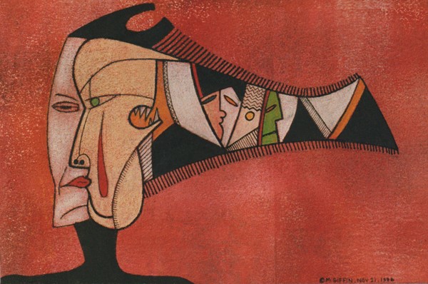 By the age of 30, he was a father of 2 and the economic disaster of the early ’90s saw the East Village dying in terms of galleries. So, he hoofed around NYC dropping off his artwork and soon began working as an illustrator for a number of publications including the Village Voice, The Atlantic Monthly, Globe & Mail and the L.A. Times Book Review. He and his family moved to Toronto in 1994 where his reputation preceded him. Getting work in Toronto brought local notoriety for Matthew and one of his illustrations became a wall-sized commission which took over 6 weeks and 340 hours (Woman & Baby below) to complete. Shortly after, he was offered a job at the CBC as a designer and in the 12 years he was there moved up to Senior Art Director, working mostly on The National.