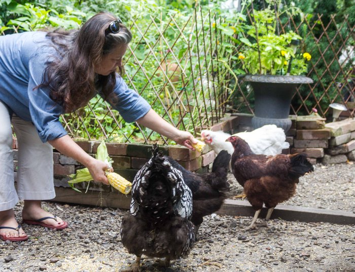 Her garden is prolific and a veritable maze of flowers, veggies, edible plants and of course, hens. While we were chatting, she stopped. “Look up. There’s a hawk. Did you notice the birds stopped tweeting and the hen is making a low cooing sound?” I did!  “She (the hen) is warning everyone to be quiet and hide.”